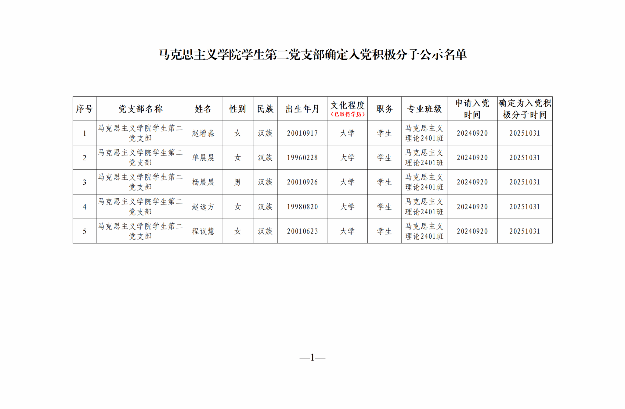 经党支部培养教育和考察,在党员推荐(群团组织推优)的基础上,2025年10月31日,马克思主义学院学生第二党支部召开支部委员会会议(或支部党员大会),经讨论研究同意确定赵增淼等5名同志为入党积极分子。根据发展党员工作要求,现将赵增淼等5名同志的情况予以公示,接受广大党员群众监督,公示期限为2025 年10月31日至11月6日)。如有异议,可在公示期内向党支部或党委(党总支)反映。