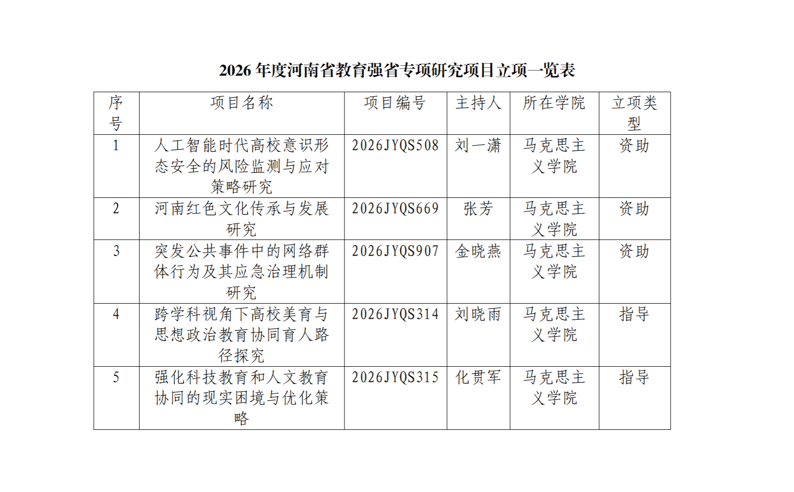 近日,中共河南省委教育工作委员会、河南省教育厅公布了《2026年度河南省教育强省专项研究项目立项名单》(豫教工委〔2025〕107号),马克思主义学院共计5项河南省教育强省专项研究项目获批支持立项。