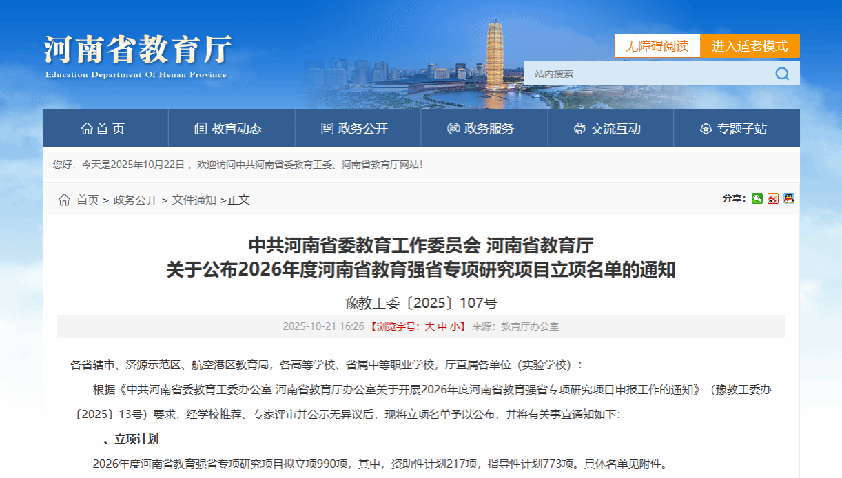 河南省教育强省专项研究项目坚持以习近平新时代中国特色社会主义思想为统领,聚焦“两高四着力”,落实立德树人根本任务,紧扣发展新质生产力对教育供给的结构性需求,以构建现代化教育体系为战略牵引,系统推进全省教育领域理论和实践问题研究,形成一批具有中原特色的教育现代化理论创新成果、制度性供给方案和改革实践范式,为教育高质量发展提供智力支撑和决策依据。