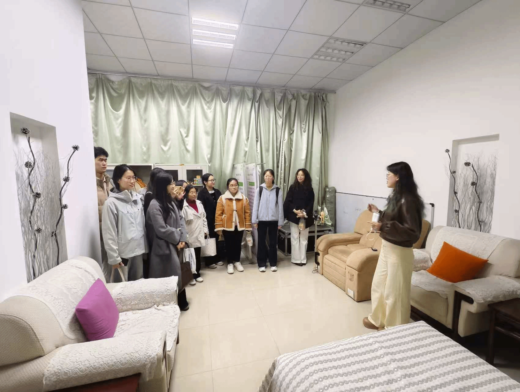 活动现场,心理中心工作人员详细介绍了中心的功能分区、硬件设施与服务内容,带领学生依次参观了个体咨询室、团体辅导室、情绪疏导室等功能空间,演示了专业心理测评系统与放松减压设备的使用方法。工作人员结合典型案例,讲解了日常心理危机识别、情绪调节技巧及求助渠道,强调了心理健康对个人成长与学业发展的重要意义。