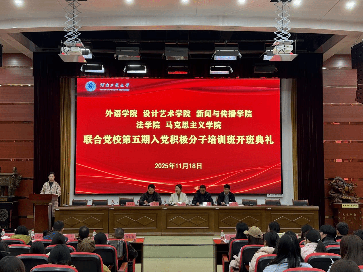 为扎实推进新时代党员发展工作,严把入党积极分子培养关,11月18日下午,外语学院、设计艺术学院、新闻与传播学院、法学院、马克思主义学院在8号楼8527会议室隆重举行了联合党校第五期入党积极分子培训班开班典礼。郑纺机党委委员、工会副主席、机关党总支书记郭富勤,郑纺机加工制造部冷作工部生产班长、全国劳动模范郭超,郑纺机党委工作部副部长赵轩、郑纺机党委工作部宣传主管朱起锋,外语学院党委书记王云涛、设计艺术学院党委书记段慧子、新闻与传播学院党委书记杨子江、法学院党委书记许文,以及外语学院党委副书记王晓东、设计艺术学院党委副书记朱玲玲、新闻与传播学院党委副书记张小鸥、法学院党委副书记张翠华和联合党校第五期全体入党积极分子参加典礼。典礼由马克思主义学院党委副书记吴若旻主持。